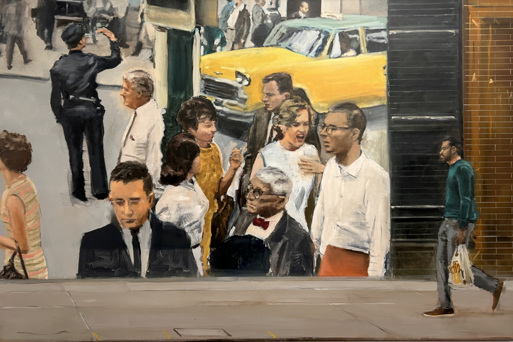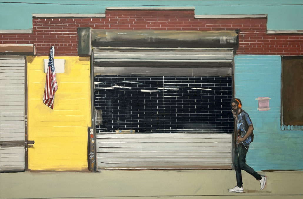 Jörg Kujawas Arbeiten bewegen sich zwischen urbanen Stadträumen, Porträts und musealen Interieurs. Häufig erscheinen seine Bildwelten wie filmische Standbilder: Ausschnitte des Alltags, in denen Bewegung, Licht und Stille aufeinandertreffen. Die Kompositionen entstehen aus dem Zusammenspiel klar gesetzter Flächen und Linien – horizontal und vertikal gegeneinander Verschoben – und werden durch Figuren, Gesten oder Details aus dem Stadtraum aufgeladen. Kabel, Hydranten, Rohre, Sicherheitskameras oder grafische Brüche fungieren dabei als strukturelle Elemente, die den Bildern Spannung und Gegenwart verleihen.