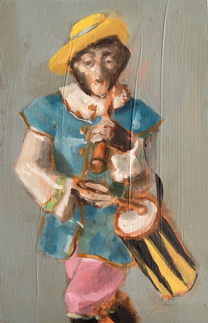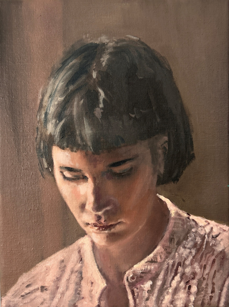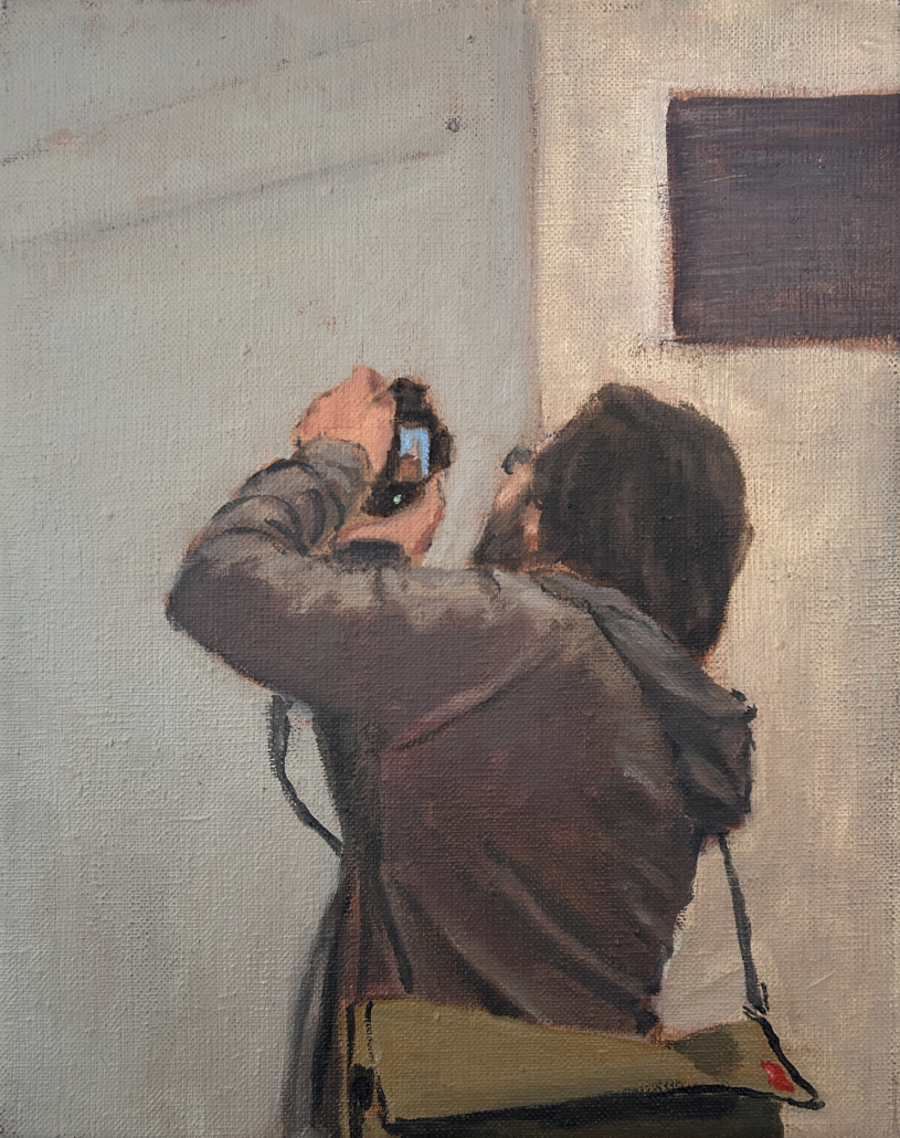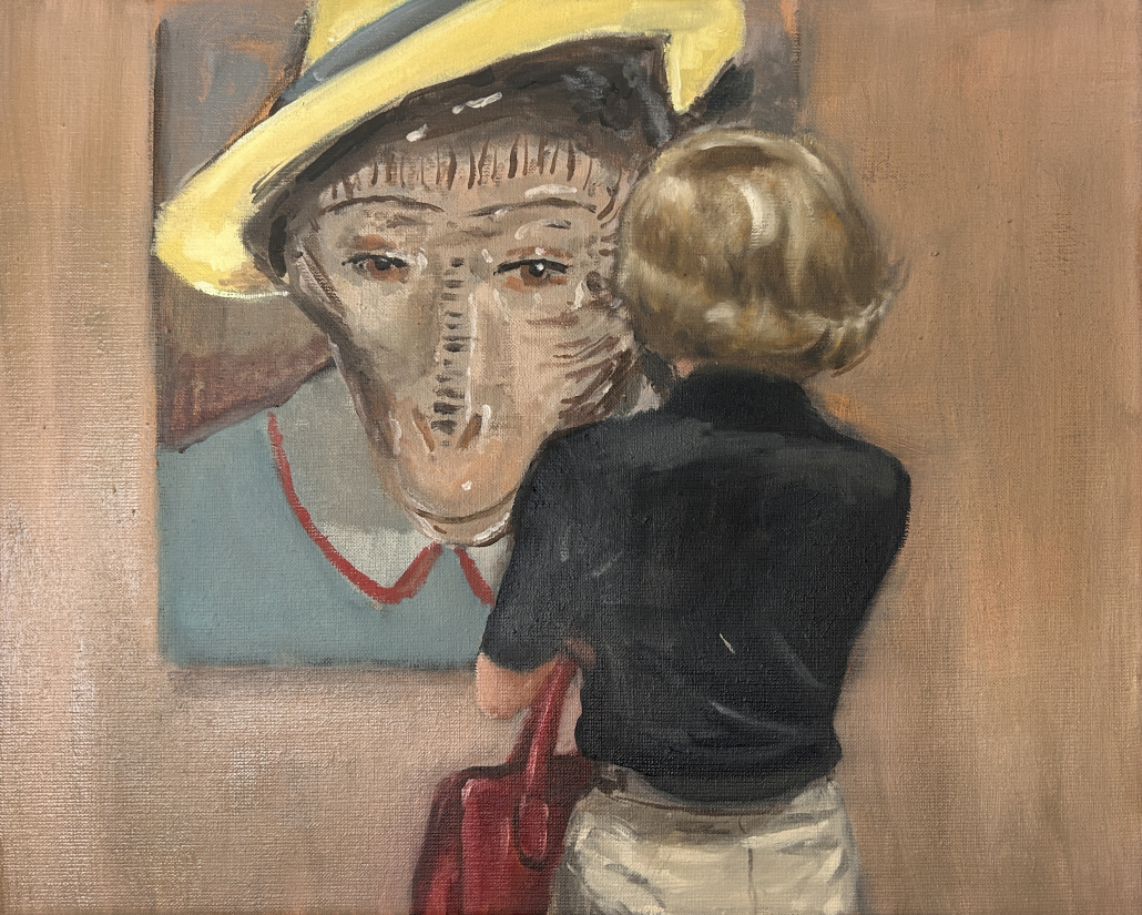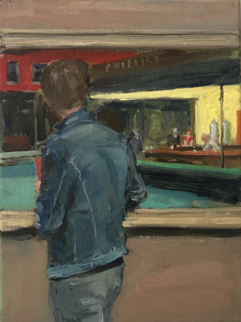 Im Zentrum steht der Moment des Sehens: das Innehalten im Vorübergehen, ein Augenblick zwischen Distanz und Nähe. Die Figuren sind dabei weniger Porträt im klassischen Sinn als Träger innerer Zustände – oft in sich gekehrt, melancholisch, ohne direkten Blickkontakt. Den Künstler interessiert nicht die exakte Abbildung, sondern das „Darunterliegende“: Stimmung, Erinnerung und psychologische Tiefe. Immer wieder arbeitet er mit dem Prinzip des Bildes im Bild – kunsthistorische Referenzen und Zitate (u. a. aus der Malerei von Degas, Vermeer, Ingres oder Manet) tauchen als motivische Ebenen auf und öffnen den Raum für neue Erzählungen.