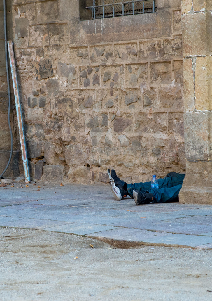 Barcelona, Mittagszeit. Eine Stadt, die sich jeden Tag neu verkauft: als sonnenverwöhntes Paradies, als pulsierende Kulturmetropole, als glänzendes Versprechen eines besseren Lebens. Doch direkt am Aufgang zur ehrwürdigen Nationalbibliothek liegt ein junger Mann im Staub, betrunken, erschöpft, unsichtbar gemacht. Die Mauern des ehemaligen Hospitals, heute architektonisches Schmuckstück, bilden die Kulisse für eine Realität, die viele gern verdrängen. Seine Beine ragen in den Raum, als unfreiwilliges Statement: Hier bin ich. Ob ihr es sehen wollt oder nicht. Nur wenige Meter entfernt fließt der Touristenstrom vorbei – Smartphones erhoben, suchend nach dem nächsten schönen Motiv. Für diesen Körper im Schatten bleibt kein Blick übrig. Er ist zu unbequem, zu nah, zu real. Die Armut, die Barcelona seit Jahren begleitet, steht im krassen Gegensatz zur glänzenden Oberfläche, die die Stadt so sorgfältig pflegt. Wer hier liegt, fällt durch jedes Raster, durch jedes Netz, durch jede Symbolpolitik. Dieses Bild ist keine Momentaufnahme, es ist ein Symptom. Es zeigt nicht nur einen einzelnen Menschen in Not, sondern ein Europa, das lernt wegzusehen. Einen Kontinent, der Schönheit feiert und Elend ausblendet, solange es nur tief genug im Schatten liegt.