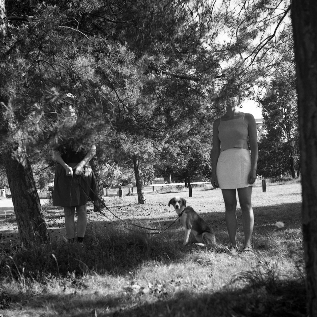 Die Arbeit gehört zum Fotoprojekt „You and me“, das Birgit Naomi Glatzel 2007 begann, kurz bevor sie für einige Jahre nach Israel zog. Sie wollte ein Bild schaffen, das ihre Freundschaften in Berlin bewahrt – ein gemeinsames Porträt statt eines bloßen Selbstbildnisses. Über die Jahre entstand daraus eine fortlaufende Serie, deren Aufnahmen jeweils mit einer Rolleiflex von 1938 und einem zehn Meter langen Luftauslöser entstanden. Das Foto „Christiane and me“ entstand im Sommer 2025 im Berliner Park am Gleisdreieck. Die Künstlerin lernte Christiane zwei Jahre zuvor im Büro kennen und beide verband die belastende Atmosphäre ihres Arbeitsumfelds. Christiane unterstützte sie in schwierigen Momenten, doch Schlaflosigkeit und Druck zwangen die Künstlerin schließlich zur Kündigung. Auch Christiane machte ähnliche Erfahrungen. Als sie das Foto planten, einigten sie sich darauf, sich zu verbergen – als Symbol ihrer Verletzlichkeit und des gemeinsamen Prozesses der Heilung. Der gewählte Ort, umgeben von Bäumen, wurde zu einem stillen Schutzraum. Für Birgit Naomi Glatzel ist Fotografie oft ein inneres Ausdrucksmittel, um herausfordernde Situationen zu verarbeiten – ein Versuch, Trauma in Verbindung zu verwandeln, oder, wie sie sagt: „horizontal – vertikal“.