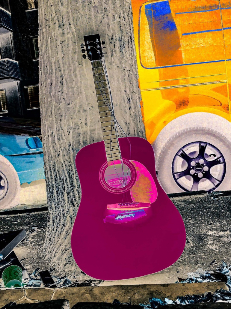 Für die Künstlerin ist die Gitarre nicht nur ein Objekt, sondern ein aktives feministisches Statement – ein Instrument, das gehört werden will. Es steht für die weibliche Stimme, für Protest, für die Sehnsucht nach Ausdruck und Freiheit. Einer saitenlosen Gitarre wurde die Stimme genommen, doch sie trägt den Klang noch in sich. Daniela Finke: „Auf dem Weg zu meinem Atelier finde ich eine blasse Gestalt zwischen Müll und parkenden Autos. Eine Gitarre lehnt an einem Baum, die Saiten gerissen, der Steg ist gebrochen. Ich bleibe stehen, in mir beginnen Akkorde zu klingen, Farben tauchen auf. Der Wunsch, dieser Gitarre ihre Würde zurückzugeben, markiert den Beginn des künstlerischen Prozesses. Ich erstelle eine dokumentarische Aufnahme der Realität, die Fotografie als nüchternes Zeugnis, als Ausgangspunkt, nicht als Ziel. Mittels einer digitalen Negativ-umkehrung transformiere ich diese fotografische Aufnahme. Die Verschiebung der Farbwerte hin zu Pink- und Purpurtönen verleiht der Gitarre eine neue Präsenz. Stärke und Würde, die einst dem Instrument innewohnten, kehren zurück und lassen es erneut leuchten. Aus einem Zeichen des Verfalls entsteht ein Bild der Hoffnung: die Kraft der Musik, die der Unterdrückung widersteht und neu erklingt. In meinem persönlichen Leben sind bildende Kunst und Musik transformative Kräfte. Sie eröffnen Räume für Ausdruck, Widerstand und Sichtbarkeit. Die Gitarre hat eine weibliche Stimme, die sich nicht zum Verstummen bringen lässt. People Have the Power ist ein Aufruf, diese Macht zu sehen und zu nutzen. In der bildenden Kunst, der Musik und der Gesellschaft. Es geht um Sichtbarkeit, um das Zurückerobern von Würde und um Mut in Zeiten der Unterdrückung.“