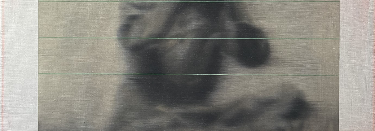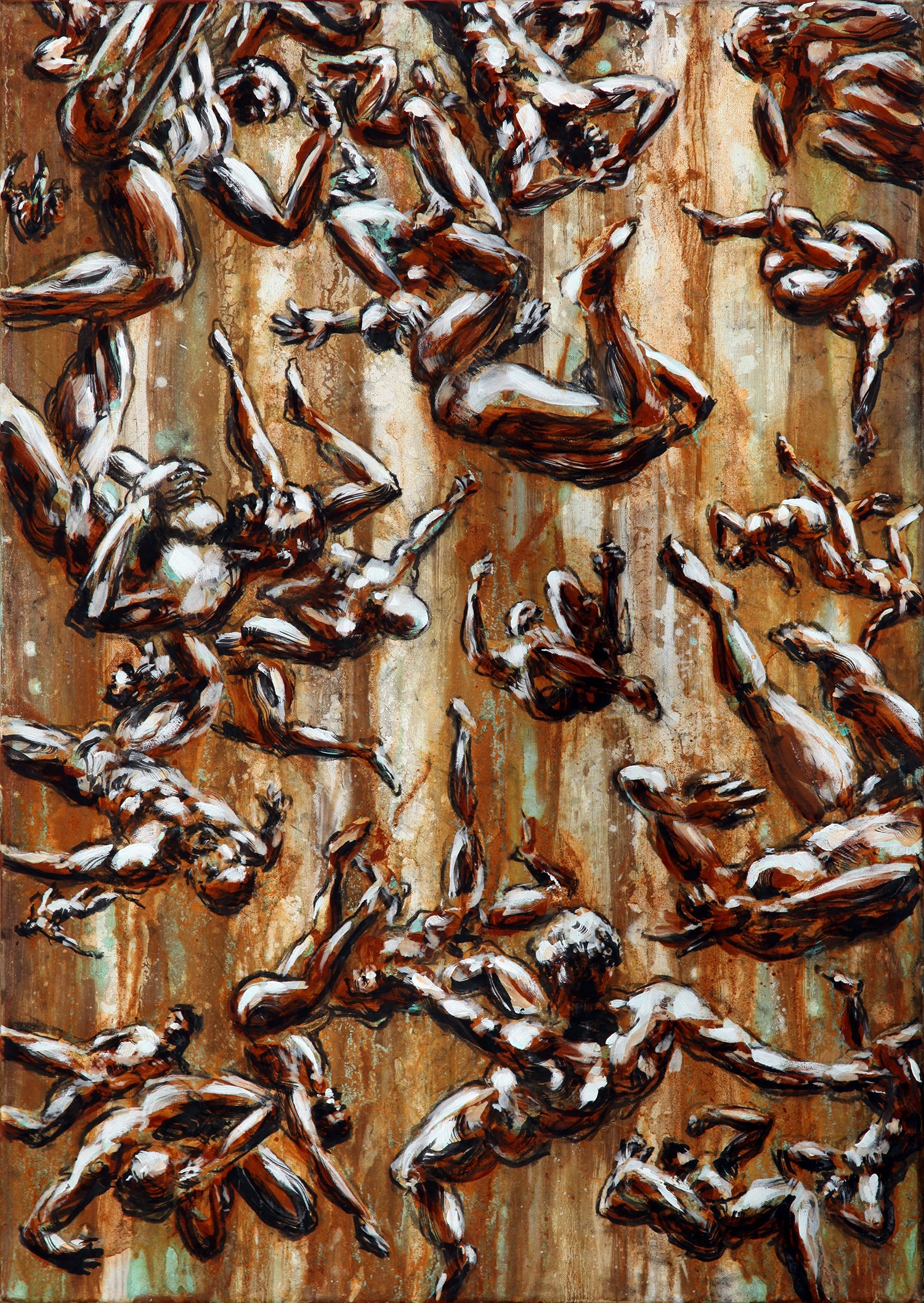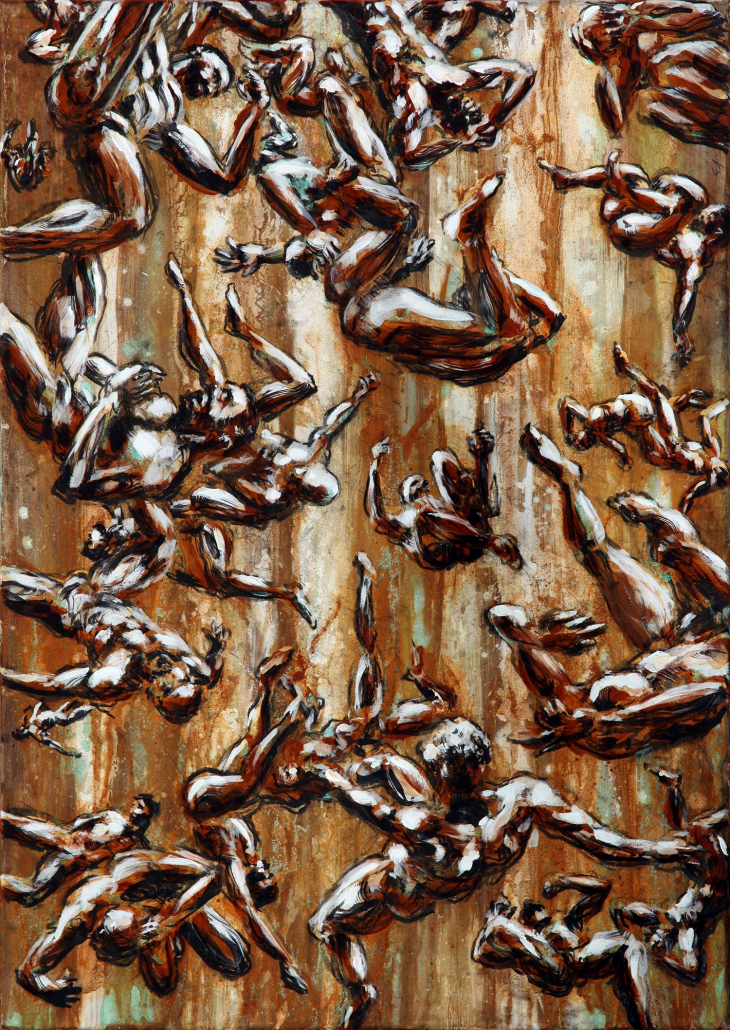 Für den Künstler bedeutet VERTICAL HORIZONS Haltlosigkeit. Er hat sich in den letzten Monaten intensiv mit dem Thema der Haltlosigkeit beschäftigt und die Haltung fallender Körper studiert. Die Hilflosigkeit und Verletzlichkeit von Körpern im freien Fall steht sowohl für das Leid und den Verlust der Würde Einzelner, als auch für den Niedergang der Vielfalt in vielen politischen Systemen. Er thematisiert damit den zunehmenden Autoritarismus und Zerfall liberaler Gewissheiten. Die fallenden Körper in den Bildern des Künstlers sind nackt und ungeschützt. Viele der Posen sind Standbilder aus Videos, in denen er sich selbst im Fall gefilmt hat. Diese Fallstudien bringen ihn ins Zentrum der Arbeit – denn auch seine Würde, Rechte und Identität als schwuler Mann sind ihm nicht sicher. Ein wichtiger Bestandteil der verwendeten Medien auf dem für diese Ausstellung geschaffenen Gemälde sind korrodierte Metalle, da diese auf Ebene der Materialität Angriff, Verletzung und Fragilität sowie auch Akzeptanz von Vergänglichkeit und Unvollkommenheit thematisieren.