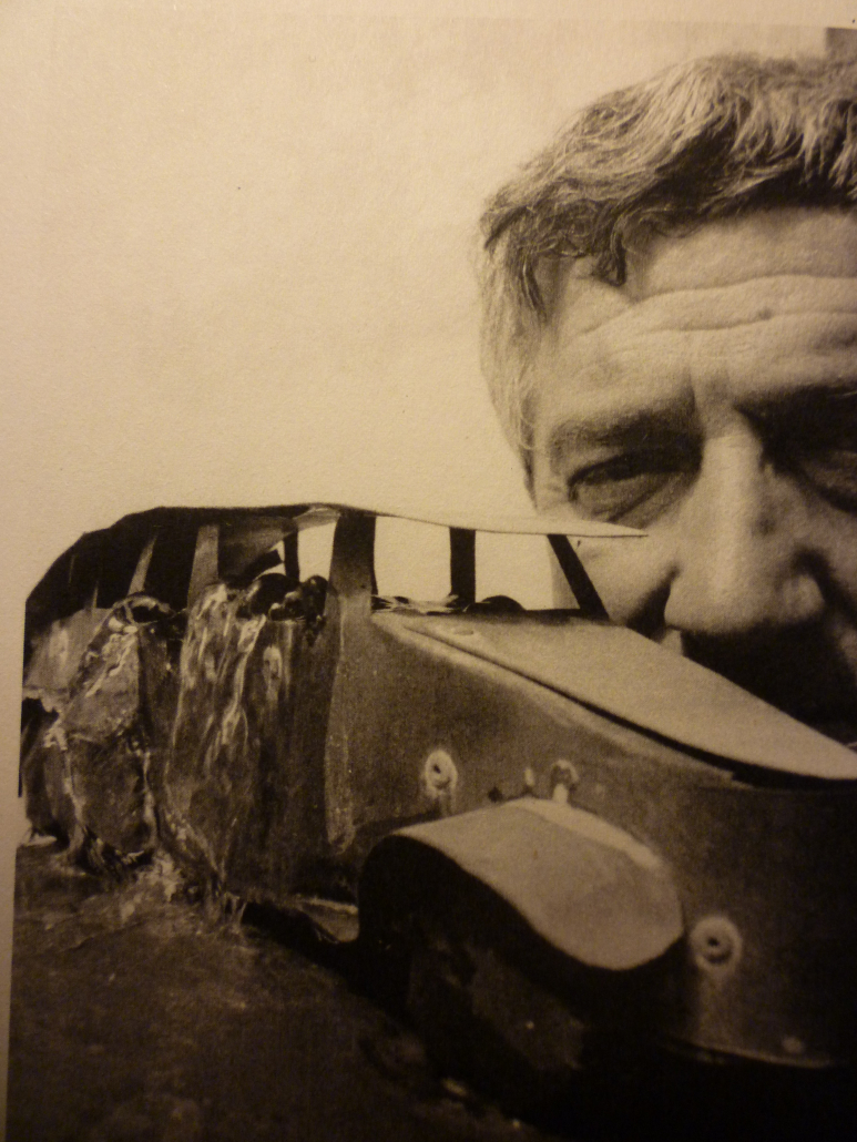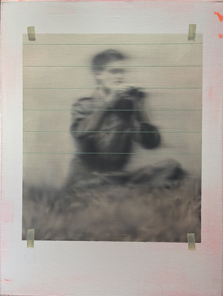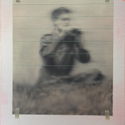 Auf den ersten Blick ist deutlich zu erkennen, dass ein unscharfes Schwarz-Weiß-Foto auf ein anderes Bild geklebt wurde. Auf dem Foto sitzt ein junger Mann auf einem Hügel und beobachtet etwas aufmerksam. Bei genauerem Hinsehen erkennt man parallele, scharfe dünne Linien, die auf dem unteren Teil fehlen. Vieles bleibt uns unverständlich und fragwürdig. Nicht alles ist so, wie es scheint.