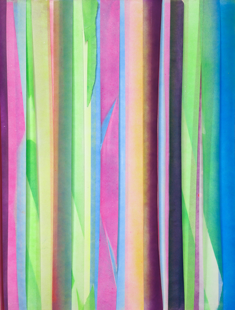 In seiner Arbeit „Resonanzlinien“ transformiert Marco Kaufmann farbiges Klebeband – ein alltägliches, flüchtiges Material – in eine poetische Metapher für gesellschaftliche Spannung und Zusammenhalt. Die vertikal angeordneten Bänder agieren wie Individuen: autonom, unterschiedlich in Farbton, Transparenz und Textur, und doch in steter Wechselwirkung. Zwischen ihnen entstehen Brüche, Überlagerungen, Lichtreflexe – fragile Zwischenräume, die Trennung und Verbindung zugleich bedeuten. Die Collagen des Künstlers entstehen im Prozess des Legens, Schichtens und gelegentlichen Abreißens: jedes Band trägt Spuren der Hand, jede Nahtstelle erzählt von Entscheidung und Zufall. In Zeiten wachsender Polarisierung wird das Kleben zur Geste des Heilens – nicht als Glättung, sondern als sichtbare Reparatur. Die Oberfläche bleibt rau, unvollendet, durchzogen von Fehlstellen und Überschneidungen: ein Bekenntnis zum Menschlichen, zum Unperfekten. Gerade in der scheinbaren Einfachheit des Materials liegt ein subtiler Widerstand – gegen Homogenisierung, gegen das Ausblenden von Differenz. Die Arbeit formuliert eine stille, insistierende Haltung: Vielfalt ist kein Defizit, sondern ein Möglichkeitsraum. Die aufrechten Linien stehen für physische Präsenz und ethische Entschiedenheit – eine Haltung, die sich nicht verbiegt, aber berührt bleibt. Der Künstler zeigt Farbe nicht als Aussage, sondern als Begegnung: ein zartes, beharrliches Plädoyer für Sichtbarkeit, Empathie und das Miteinander der Verschiedenen.