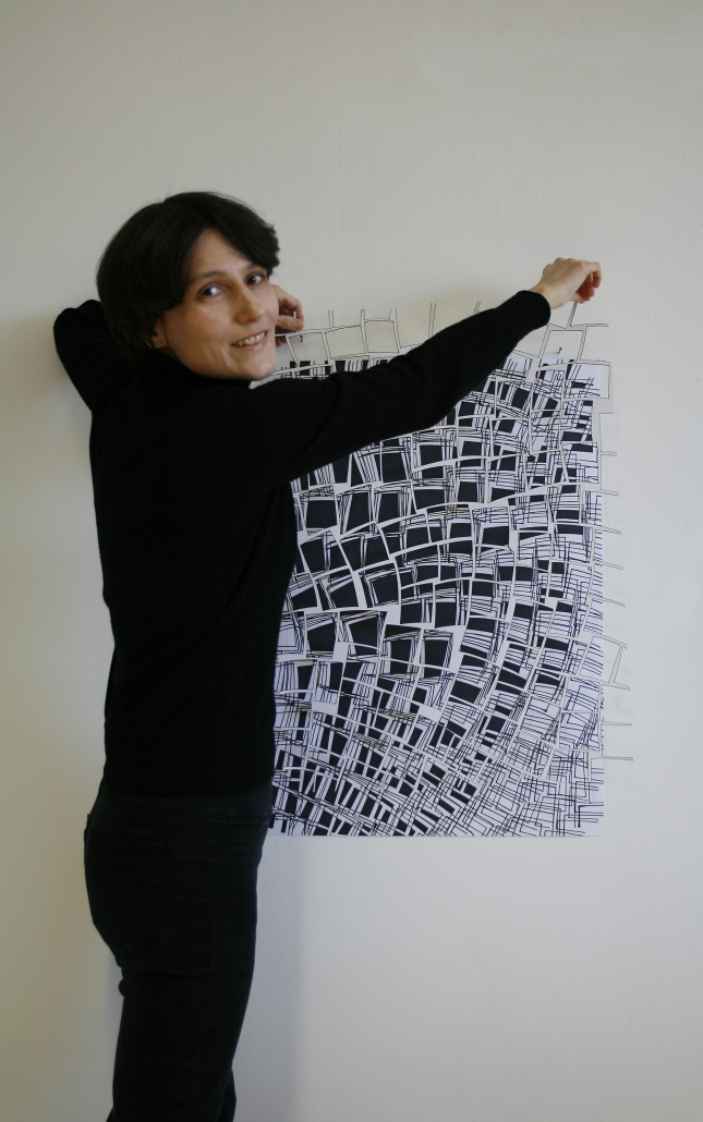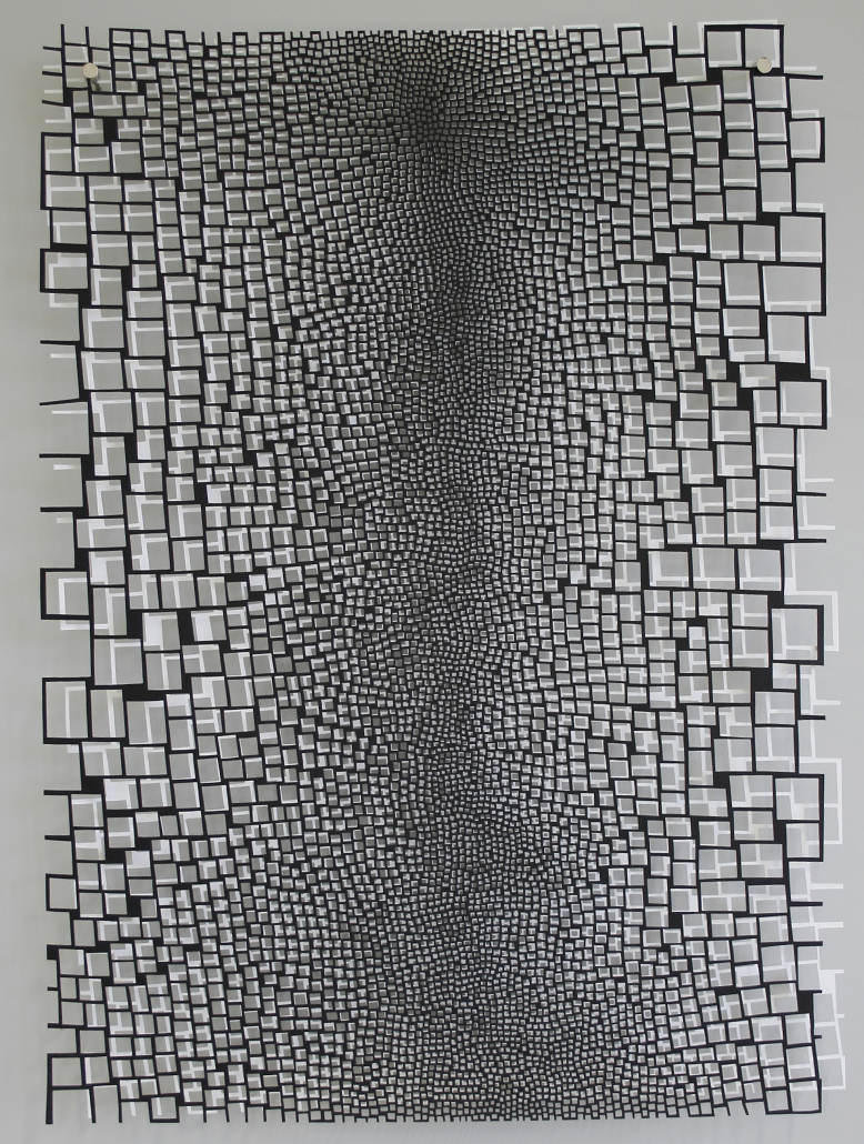 In ihren Arbeiten kombiniert Violetta Elisa Seliger von Hand geschnittene Rasterstrukturen aus Papier zu reliefartigen Bildcollagen – auf der Suche, zwischen Gegensätzen eine größtmögliche Balance und Harmonie zu finden. Die einzelnen Lagen werden mit unterschiedlichen Abständen voreinander gehängt, so dass eine räumliche Wirkung entsteht. Alle Arbeiten haben gemeinsam, dass sie in der Kombination von Schwarz-Weiß-Kontrasten und mehreren Schichten (durch Reihungen, Überlagerungen und Verdichtungen) wirken. Die Arbeitsprozesse, in denen die Papierschnitte entstehen, sind gerade in den aktuell unruhigen Zeiten für die Künstlerin essentielle Rückzugsräume. Diese geben ihr die Möglichkeit, verschiedene Ebenen von Gedanken und Gefühlen wahrzunehmen, wo sich Gedanken verdichten und wieder auflösen können. Die rasterartigen Strukturen entstehen dabei intuitiv. Für die Ausstellung hat die Künstlerin eine Arbeit ausgewählt, die aus zwei voreinander geschichteten Papierschnitten besteht, einem weißen und einem schwarzen, die als Symbole für jegliche Gegensätze (z.B. Meinungen, Identitäten etc.) gesehen werden können. Die Kontraste begegnen sich hier und treten in Beziehung zueinander. Die einzelnen Rasterstrukturen verdichten sich in der Mitte und lösen sich nach außen wieder auf. Diese Wirkung wird durch die zwei Ebenen und die unterschiedlichen Abstände verstärkt. Dadurch wird im übertragenen Sinn ein Raum zwischen den beiden Lagen geschaffen, in denen ein Dialog stattfindet. Im Zentrum haben die Papierschnitte ihren größten Berührungspunkt und ihre größte Verdichtung – womöglich ein Hinweis auf die Stärke der Verbindung und damit gleichzeitig den verletzlichsten Punkt?