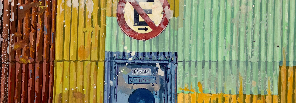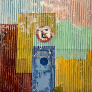 Die Künstlerin untersucht das Spannungsfeld zwischen vertikalen und horizontalen Linien. Der Horizont erscheint nur marginal, der Blick wird von einer frontal stehenden Wand aus farbig gestrichenem Wellblech aufgefangen. Was zunächst als abweisende Barriere wirkt, entfaltet durch die poröse Oberfläche und die pastellige Schichtung alter Farbanstriche eine unerwartete visuelle Tiefe. Spuren von Improvisation, Witterung und Überlagerung verleihen der Arbeit eine vielschichtige Materialität. Die Inspiration entstammt einer entlegenen Region Patagoniens, in der natürliche Baustoffe rar sind. Vorhandene Materialien werden über Jahrzehnte hinweg wiederverwendet. Diese nachhaltige Praxis erzeugt unbewusste Farb- und Formkompositionen, die sich an unscheinbaren Orten verbergen. Gerade diese zufällig entstandenen Farbfelder faszinieren die Künstlerin – abstrakte Flächen, die sich zu subtilen, fast malerischen Kompositionen im Stadtraum verweben. Mit dieser Arbeit lädt die Künstlerin Betrachter:innen dazu ein, Schönheit in der spröden Textur des Alltäglichen zu entdecken, Spuren von Zeit und Gebrauch wahrzunehmen und die fragile Materialität unserer Umwelt neu zu betrachten.