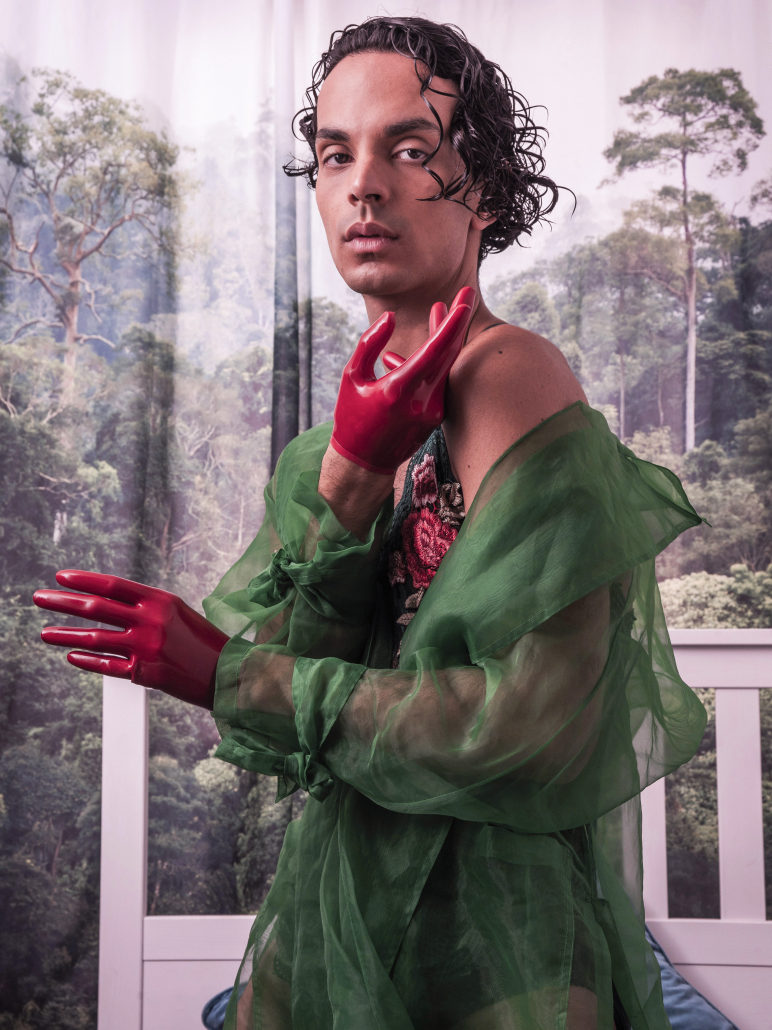 In diesem Porträt des brasilianischen Performancekünstlers Marcelo nimmt Trotz nicht durch Konfrontation Gestalt an, sondern durch Anmut, Schönheit und eine unerschütterliche Präsenz. Eingehüllt in durchscheinenden grünen Stoff und vor einer üppigen, traumhaften Kulisse steht Marcelo mit einer stillen Kraft, die sowohl zart als auch unzerbrechlich wirkt. Die leuchtend roten Handschuhe werden zu einem Symbol des Widerstands – sie bekräftigen Individualität und fordern Raum in einer Welt, die oft Konformität verlangt. Hier gibt es keine Spur von Opferhaltung. Stattdessen spricht das Porträt von stiller Beharrlichkeit und künstlerischer Selbstermächtigung. Marcelos Blick ist ruhig, weder flehend noch entschuldigend, sondern eine komplexe Mischung aus Verletzlichkeit, Humor und Widerstandsfähigkeit. Das Werk würdigt Queerness nicht als Randerscheinung, sondern als strahlende und lebenswichtige Kraft, die das Recht auf Schönheit, Komplexität und Hoffnung einfordert. Wir leben in einer Zeit, in der das Ausdrücken des authentischen Selbst – insbesondere innerhalb der Queer- und Trans-Communities – politisiert wird und Hass und unbegründete Ängste hervorruft. Doch angesichts dieser Feindseligkeit gibt es eine außergewöhnliche Stärke. Jeder Akt der Selbstdarstellung, jedes Beharren darauf, wahrhaftig gesehen und benannt zu werden, wird zu einer Form des stillen Widerstands. Dale Grant sieht dieses Porträt als Erweiterung seiner Blumenporträts. Zerbrechlich und doch beständig blühen sie trotz aller Kräfte, die sie zerstören oder verwelken lassen könnten. Auf dieselbe Weise blühen queere und transsexuelle Menschen in einer Welt weiter, die sich oft weigert, sie zu fördern, und verkörpern eine trotzige Anmut, die Verletzlichkeit in Kraft verwandelt.