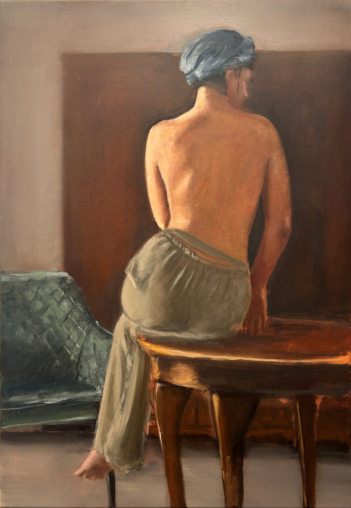 Im Gemälde „Nude“ deutet Jörg Kujawa das klassische Bild La Baigneuse Valpinçon von Ingres zeitgenössisch hinsichtlich der Thematik von Verletzlichkeit und menschlicher Integrität. Ihm geht es nicht um idealisierte Vollkommenheit, vielmehr um den Menschen in seiner sinnlichen Präsenz. Der Körper erscheint entblößt, aber nicht exponiert. Die Abgewandtheit schafft Distanz, ohne sich dem Moment zu verschließen. Licht und Schatten modellieren die Form mit Sanftheit und lassen eine Ruhe entstehen, die sowohl fragil als auch gefasst wirkt. Gerade die Haltung – gesammelt, aufrecht, in-sich-ruhend – verleiht der Figur eine stille Erhabenheit. Das Werk öffnet einen Raum zwischen Klassik und Gegenwart: Die Erinnerung an Ingres bleibt spürbar, dient jedoch vor allem als Ausgangspunkt, um ein heutiges Verständnis von Körperlichkeit, Sensibilität und menschlichem Selbstverständnis zu formulieren. Zugleich verweist die malerische Oberfläche – die sichtbaren Pinselzüge, die fein gesetzten Übergänge und die Faktur der Ölfarbe – auf den körperlichen Prozess der Entstehung selbst. So entsteht ein Bild, das nicht nur zeigt, sondern nach innen wirkt: ein Moment ruhiger Konzentration, verletzlich, aber nicht wehrlos, erhaben und: schön. Die Arbeit rückt einen Körper ins Zentrum, der weder Stärke inszeniert noch in Opfergesten verharrt – eine Haltung, die leise, selbstbewusst und zutiefst menschlich bleibt. In einem gesellschaftlichen Klima, in dem viele Identitäten unter Druck geraten, erscheint diese Form von Würde als Gegenbild zu den Verhärtungen der Gegenwart