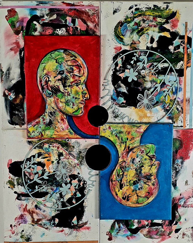 Die Collage zeigt Androniki, eine Transfrau, die ihr Gesicht bedeckt und mit gespannter Körperhaltung nach vorne drängt. Der Moment wirkt roh, direkt, fast aggressiv – und ist zugleich von großer Zärtlichkeit. Das Verbergen wird hier nicht als Rückzug, sondern als Geste des Selbstschutzes und der Selbstbehauptung lesbar. Das Bedecken des Gesichts wird zu einer Form des Sprechens, zu einem Akt des Trotzes: „Ich bestimme, was ihr sehen dürft.“ Den Künstler interessiert an diesem Werk die Gleichzeitigkeit von Stärke und Verletzlichkeit, von Schönheit und Widerstand. Der Körper wird zur Bühne eines inneren Konflikts, zu einem Ort, an dem Identität verhandelt und neu definiert wird. Das Bild fragt, was Sichtbarkeit bedeutet, wenn Sichtbarkeit zugleich Gefahr und Empowerment ist. Im Kontext von Vertical Horizons steht dieses Porträt für einen aufrechten, körperlichen Trotz. Es zeigt keine Opferrolle, sondern den Moment des „Ich bin hier“ – lautlos, aber unübersehbar. In Zeiten, in denen queere und trans Körper erneut politisch instrumentalisiert und bedroht werden, ist das Bild ein Bekenntnis zur Würde des Selbst, zur Schönheit des Besonderen, zur Freiheit, sich zu entziehen und doch präsent zu sein.